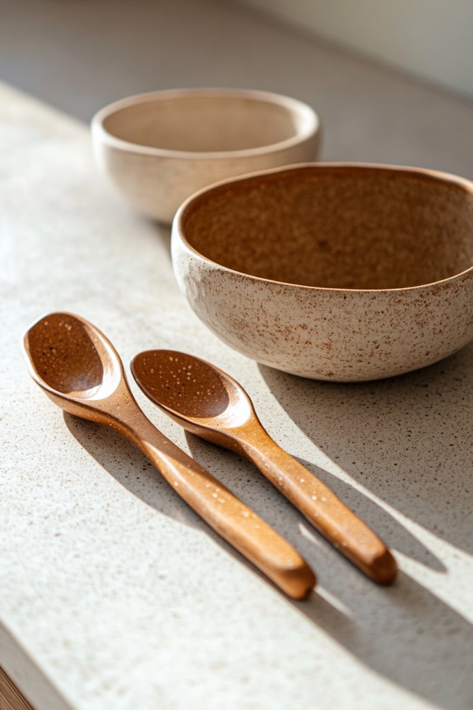 Imagine wooden spoons, silicone spatulas with matte finishes, and bamboo tongs neatly arranged in a handcrafted ceramic holder. The neutral tones and simple shapes blend effortlessly with textured linens and natural wood surfaces. Every tool feels like part of a curated collection, adding understated elegance and convenience.
