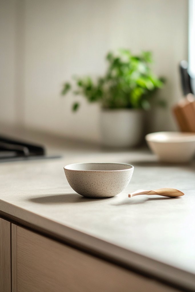 Imagine a pristine surface with only a few carefully chosen items—like a handcrafted wooden utensil holder, a simple ceramic bowl, and a textured linen cloth. Everything is within reach but not overwhelming. The clean surface reflects light softly, emphasizing natural textures and materials. It invites you to cook, prep, and gather effortlessly.