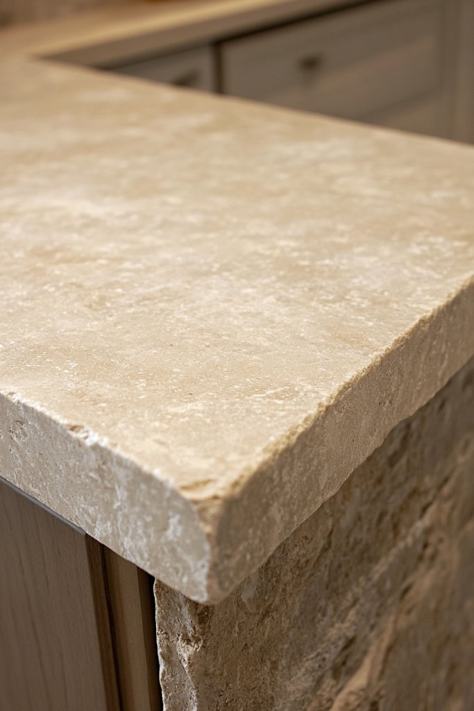 Add subtle inlays or carved details to enhance the organic feel. Pair with natural wood or bamboo accessories to complement the stone’s understated elegance. Use handcrafted cutting boards made from olive or maple wood for a cohesive look. Keep the surface clutter-free with sleek, minimalist utensil holders or storage containers in ceramic or natural fiber materials.