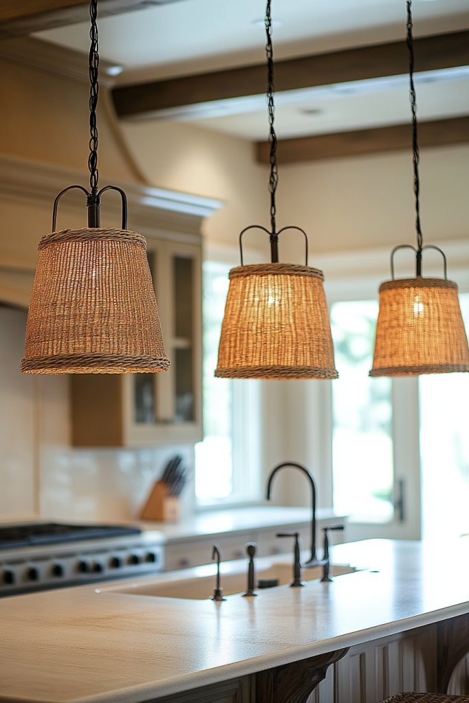 Select pendant lights with woven or braided fibers in neutral tones like beige, taupe, or soft gray. For a more contemporary twist, choose sleek, sculptural designs in natural fibers with clean lines. In larger kitchens, cluster multiple pendants at varying heights for visual interest. Seasonal shifts can include adding fabric or tassels for a playful or cozy touch.