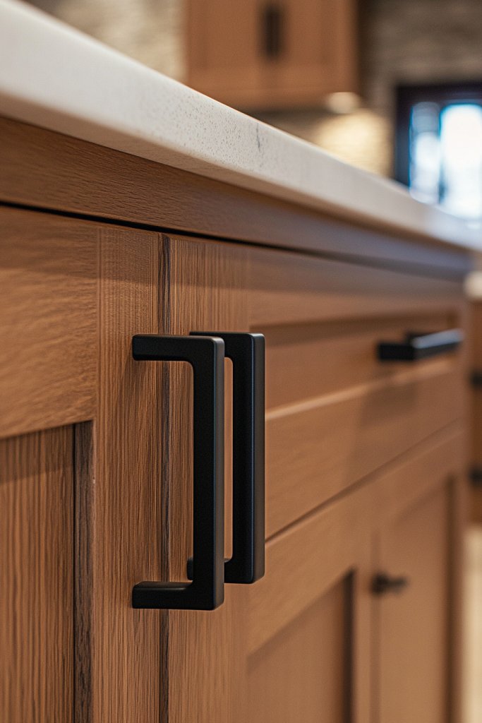 Visualize matte black or brushed bronze pulls with sleek, simple lines on light wood cabinetry. Handles are unobtrusive, allowing the natural grain to take center stage. The hardware’s subtlety enhances the overall harmony, while the matte finishes add a soft, organic touch. It’s all about understated elegance that feels effortless.