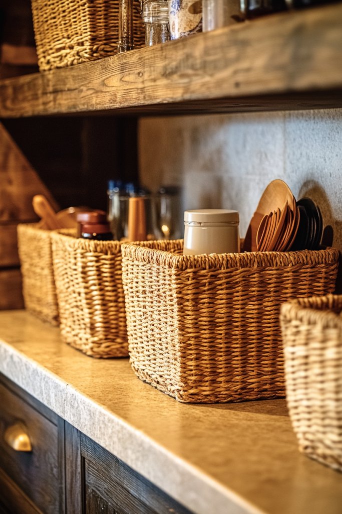 Imagine woven baskets in light beige or caramel tones lining open shelves or under the counter. They hold fresh produce, utensils, or fresh linens, adding a tactile element to your kitchen. The natural fibers’ rough texture contrasts beautifully with smooth ceramics and sleek wood, creating a layered, inviting look. Sunlight highlights the weave’s intricate patterns, adding visual depth.