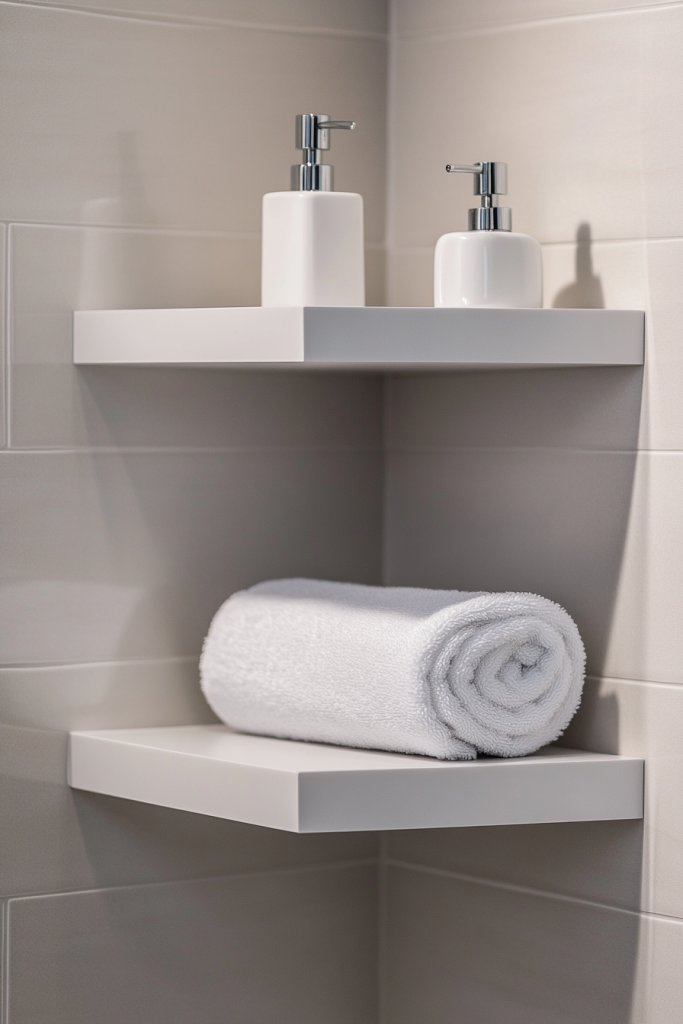 Imagine sleek, floating shelves snugly fitted into a corner, with a soft matte finish that catches the light just right. They hold neatly rolled towels, small jars of creams, and decorative baskets, creating a tidy yet inviting nook. The minimalist design keeps the space airy, while the open shelves add a touch of modern elegance. It’s like turning an awkward corner into a feature.