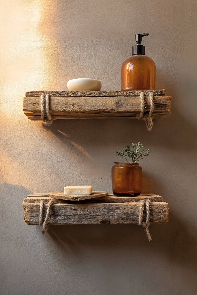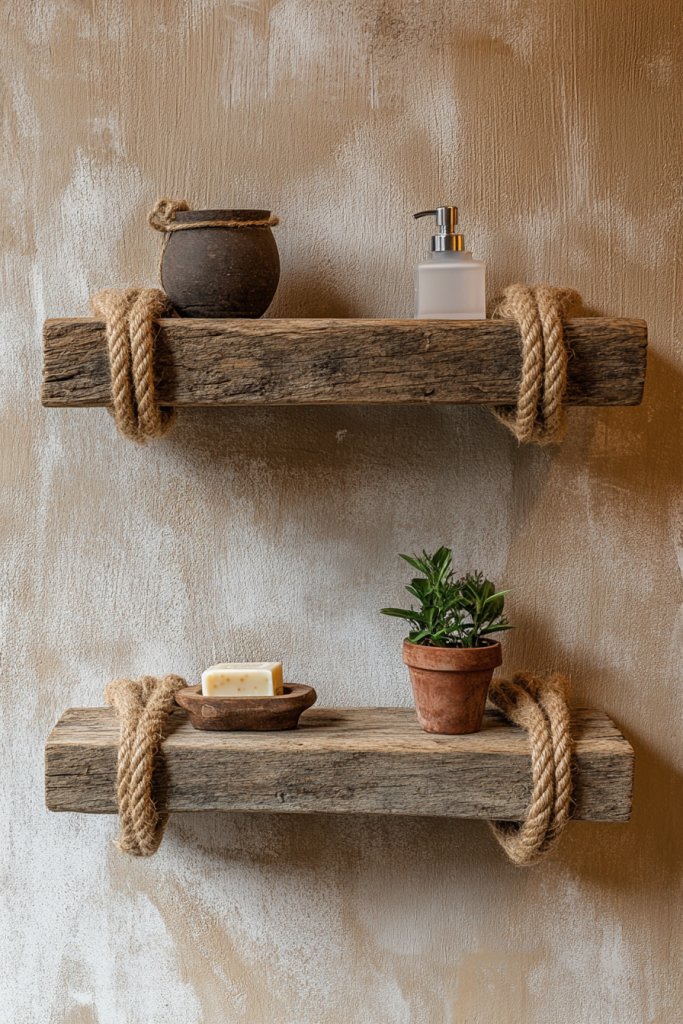 Imagine thick, weathered wood planks hanging from thick, knotted ropes secured to the wall with eye hooks. The natural knots and imperfections add character, while the ropes lend an industrial feel. These shelves hold towels, small jars, or decorative items, creating a cozy, earthy vibe that’s both functional and beautiful.