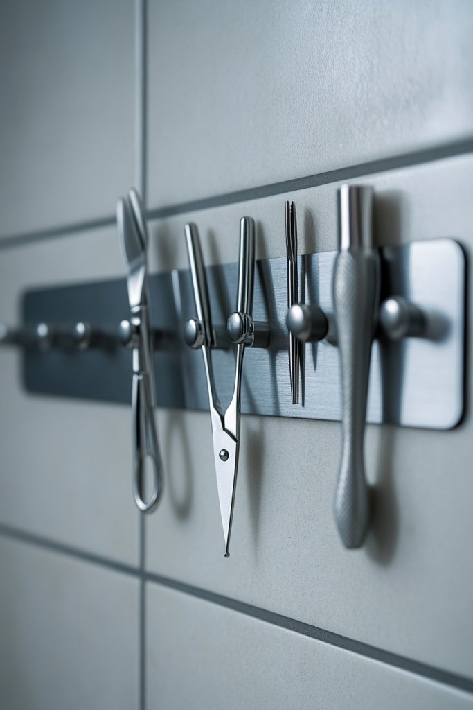 Visualize slim metal strips mounted inside cabinet doors or on walls, with small magnetic containers attached. These containers hold tiny tools or jewelry, keeping everything visible and easy to access. The minimalist look blends seamlessly with modern decor, reducing visual noise.