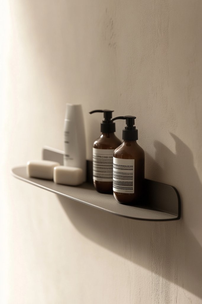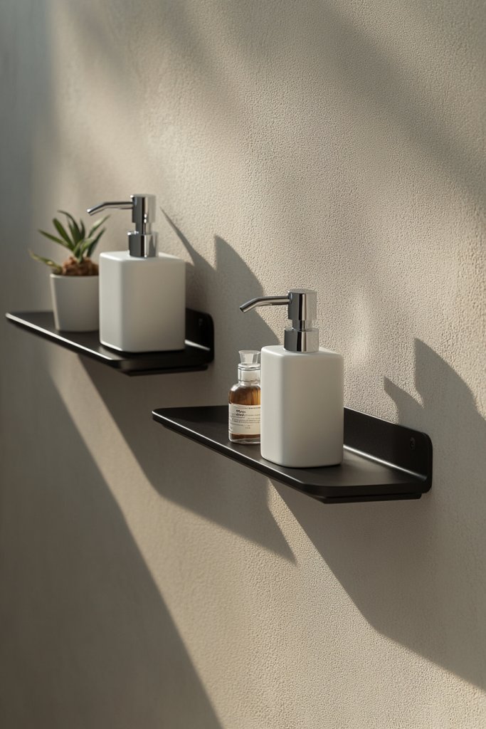 Picture narrow, elongated shelves mounted at eye level, with a slight raised edge to prevent items from falling. They hold essentials like small bottles, soaps, or skincare jars. The sleek profile adds a modern touch without cluttering the wall, making the room feel more open.