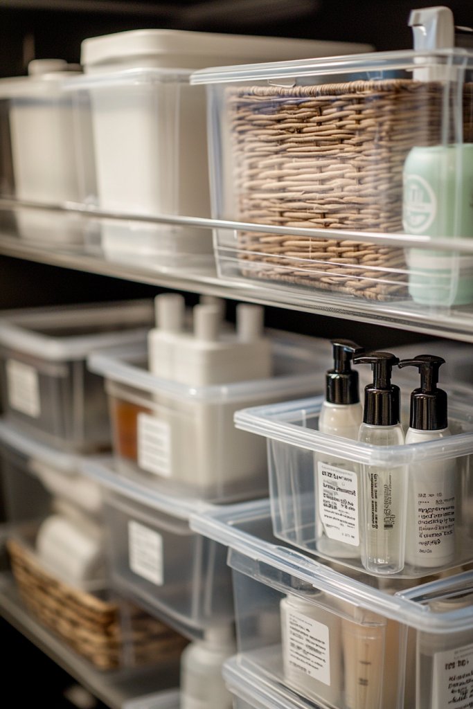 Picture stackable, transparent containers filled with toiletries, sponges, and cleaning products, neatly arranged on adjustable shelves. The clear material lets you see everything at a glance, reducing clutter and frustration. Labeling adds a touch of order and professionalism.