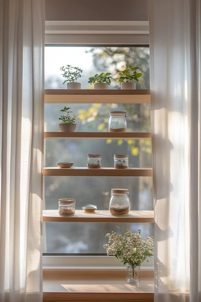 Want to utilize vertical space above your window without blocking natural light? Tiered over-the-window shelves offer a charming way to add storage for decorative or functional items. They brighten up your room while keeping essentials within reach.