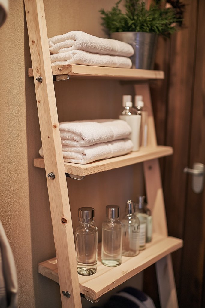 Picture a tall, leaning wooden ladder with multiple rungs, each holding rolled towels, small baskets, and skincare bottles. The natural grain or painted finish adds character, making it a statement piece. Lean it against the wall for a relaxed vibe or attach it securely for a more permanent setup. Either way, it adds a touch of rustic charm.
