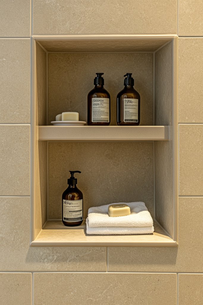 Ever wished your bathroom had hidden storage that doesn’t stick out like a sore thumb? Recessed shelving provides a sleek, built-in solution that keeps clutter out of sight while maintaining a minimalist vibe. It’s perfect for small spaces where every inch counts.