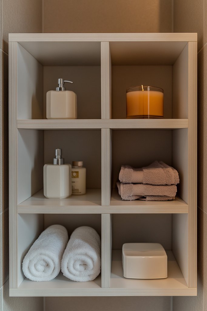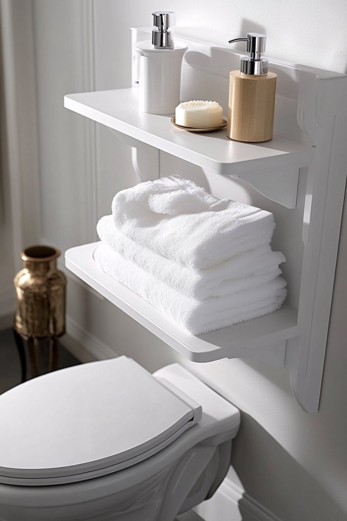 Picture a multi-tiered shelf unit with open cubbies or slim shelves, painted in a crisp white or a bold color. It holds folded towels, toiletries, and decorative accents like candles or baskets. The vertical design draws the eye upward, making the room feel taller and more spacious. It’s a simple yet effective upgrade.