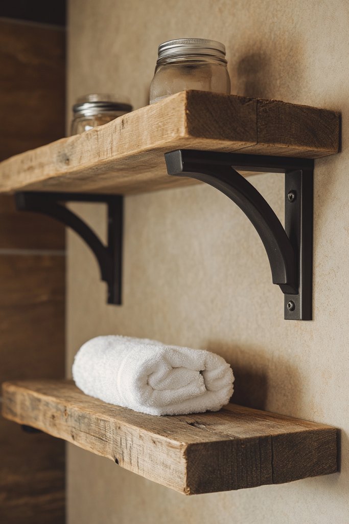 Visualize reclaimed wood planks supported by industrial-style metal brackets. The natural grain and imperfections of the wood add authenticity, while the metal brackets lend an edgy contrast. These shelves hold plush towels, soap dishes, or decorative jars, creating a layered, textured look. It’s a blend of vintage charm and modern functionality.