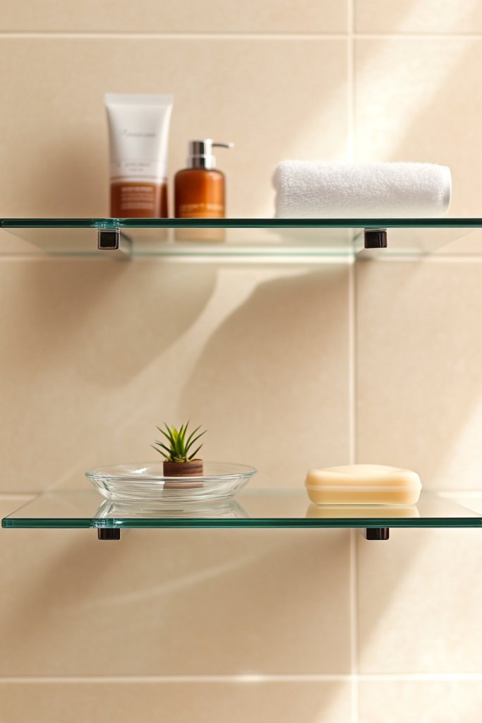Picture clear or frosted glass shelves mounted with minimalist brackets, creating an almost floating effect. They hold neatly arranged toiletries, decorative containers, or small accessories, all visible yet unobtrusive. The transparency allows light to pass through, making the space brighter and more open.