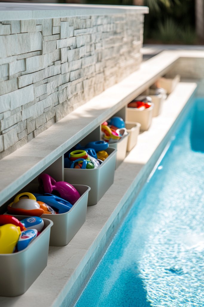 Decorate the shelves with waterproof containers, decorative stones, or small sculptures (avoiding restricted items). Use lighting to highlight the storage areas for nighttime convenience. Add hooks or racks nearby for quick access to towels or pool tools. Incorporate a small outdoor cabinet or bench for extra storage or seating. Seasonal touches like colorful cushions or themed accessories can make the space inviting and functional.