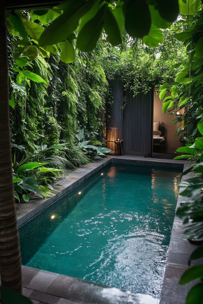 Imagine a compact pool nestled amid tall, leafy vertical gardens climbing up surrounding walls or fences. Climbing vines and potted plants soften hard surfaces and add vibrant textures. Tall planters or green walls act as natural privacy screens, shielding you from neighbors. Soft lighting highlights the greenery at night, creating a cozy, secluded atmosphere. The mixture of water and greenery produces a peaceful, resort-like vibe, transforming your yard into a small urban jungle.