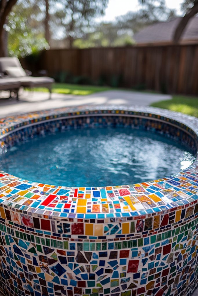 Choose mosaic patterns that match your style—geometric, floral, or abstract. Use bold colors or subtle tones, depending on your decor. For seasonal changes, swap out accessories or add floating lights. Keep the pool shallow for easy maintenance and safety—perfect for kids or relaxing dips. Add decorative stones or potted plants around the pool for extra charm. The design is versatile and adaptable to various tastes.