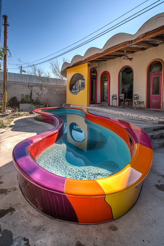 Imagine a pool with a freeform, organic shape that mimics a natural pond or lagoon. Bright, bold colors—think turquoise, coral, or mosaic-inspired patterns—bring energy and personality. Surround the pool with sculptural elements, colorful tiles, or artistic decking. At night, underwater LEDs or fiber optics highlight the shape and colors, creating a mesmerizing scene. The overall effect is a lively, artistic environment that invites curiosity and joy. It’s a visual celebration of creativity.