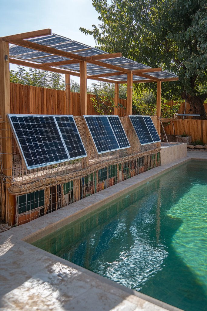 Picture a small pool constructed from recycled plastic or reclaimed wood, with natural stone accents. The water heats naturally via solar panels or collectors installed nearby—no need for expensive electric heaters. Surround the pool with eco-friendly decking, such as composite made from recycled plastics or sustainably sourced wood. During sunny days, the solar system powers the heating, creating a warm, inviting pool. The overall scene feels earthy, modern, and responsible—perfect for eco-conscious homeowners. The visual harmony of natural and recycled elements emphasizes sustainability.