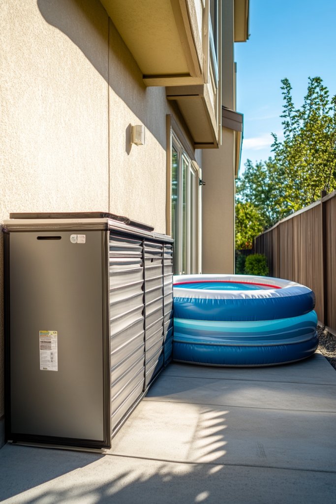 Picture a sleek, compact inflatable pool tucked into a corner of your patio, with a chic outdoor storage box nearby. When summer ends, you deflate, fold, and neatly store the pool inside a decorative wooden crate or a modern storage bench. The area stays clean and clutter-free, yet always ready for spontaneous pool days. Brightly colored pool liners peek out from behind minimalist sliding doors, adding a playful touch. When summer rolls around, you quickly inflate, set up on the deck, and enjoy your mini oasis, transforming your outdoor space effortlessly.