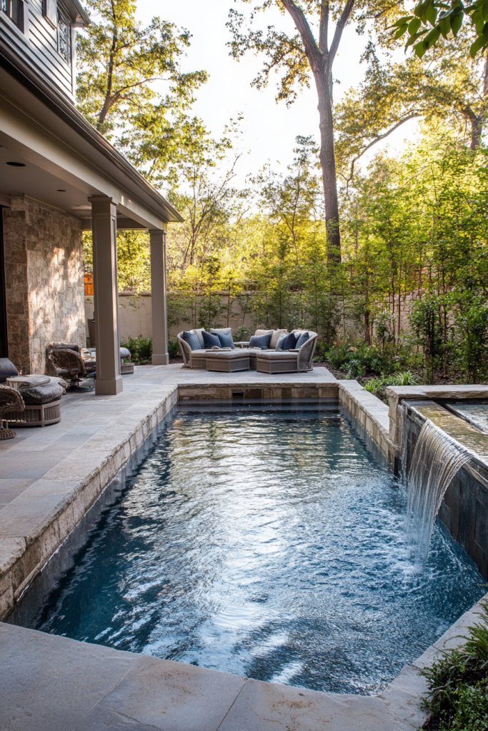 Imagine a sleek, wall-mounted pool embedded into a blank exterior wall. Water cascades down from the top in a smooth curtain, creating a soothing sound and mesmerizing visual. The wall behind the water feature can be textured or painted in bold colors to enhance its modern aesthetic. Underneath, a narrow ledge or seating area provides space for relaxation, with soft lighting highlighting the water’s movement. The effect is both calming and eye-catching, transforming your yard into an urban retreat that feels expansive despite limited space.