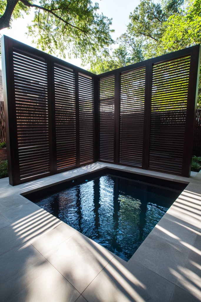 Imagine a sleek, rectangular plunge pool nestled behind tall, decorative privacy screens made from wood or metal. The water is crystal clear, inviting you to dip your toes or take a full swim. Tall planters or trellises with climbing vines flank the sides, enhancing seclusion and adding greenery without clutter. Subtle lighting along the screens or pool edges creates a cozy ambiance at night. The whole setup feels like a private sanctuary, perfect for unwinding after a busy day.