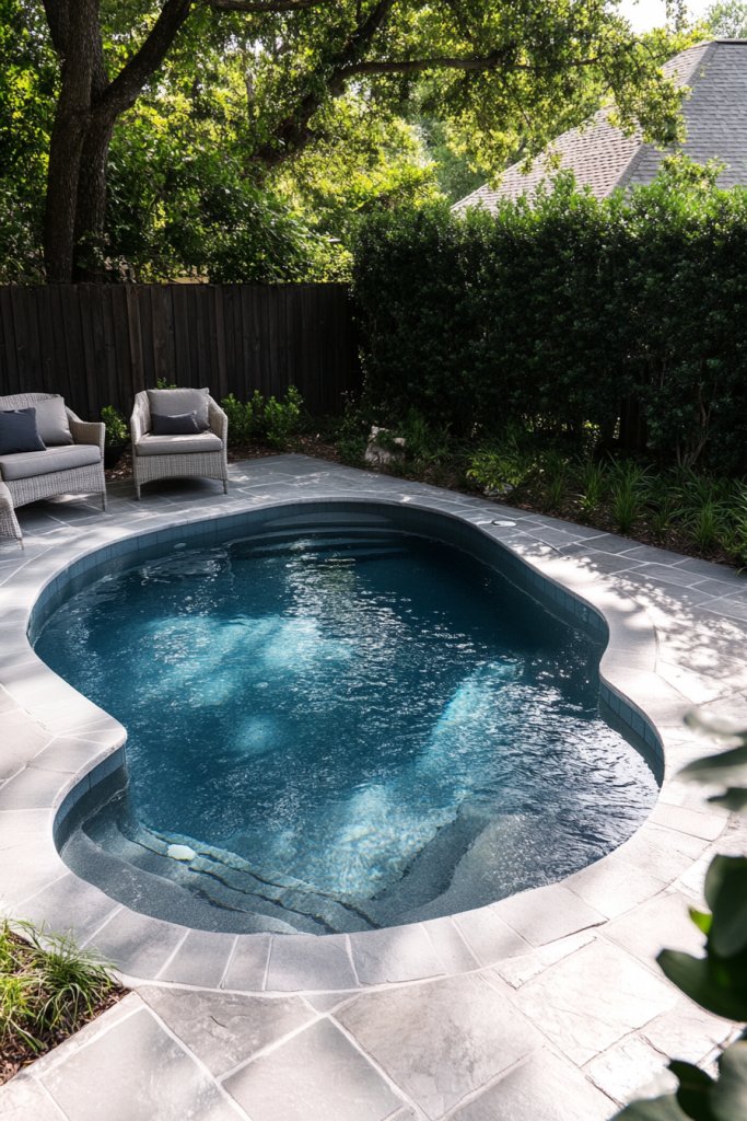 Envision a uniquely shaped pool tucked neatly into a corner, perhaps L-shaped or triangular. The sleek edges follow the natural angles, creating a seamless flow into your outdoor layout. Surround it with minimal decking or natural stone to keep the look clean. Tall fencing or privacy screens on two sides shield the area from neighbors, ensuring seclusion. During the day, sunlight reflects off the water, creating a lively centerpiece; at night, subtle lighting adds a cozy glow. It’s a smart, stylish use of tight space that feels open and inviting.