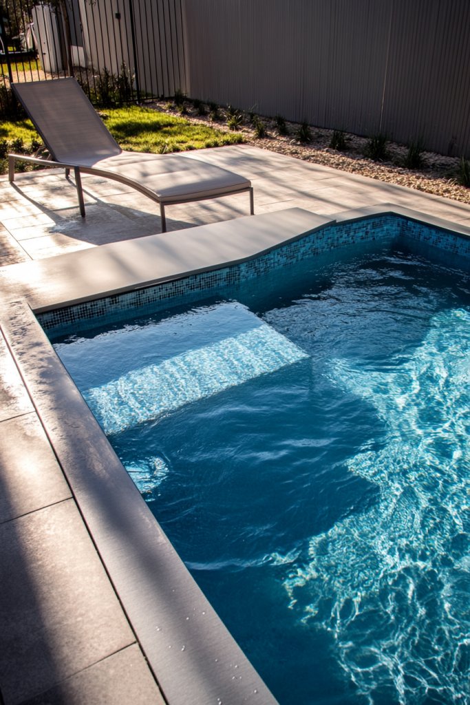Picture a sleek, rectangular pool with a shallow, wide ledge at one end, perfect for lying down and soaking up the sun. The water is crystal clear, and the ledge features a textured surface to prevent slipping. Surrounding the pool is a narrow deck with minimalist furniture, making the most of the space. During the day, you can lounge on the ledge or take a quick dip, while at night, soft lighting highlights the water’s gentle ripples. It’s a functional, inviting area that invites relaxation.