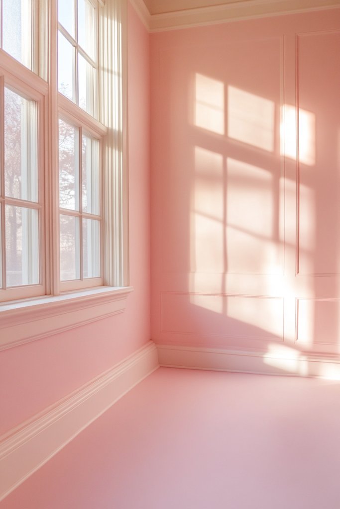 Picture walls painted in a delicate blush hue that softens the natural light, creating a warm glow. Complement with plush cushions, textured throws, and elegant curtains to enhance the romantic vibe. Light-colored furniture and subtle metallic accents complete the refined look.