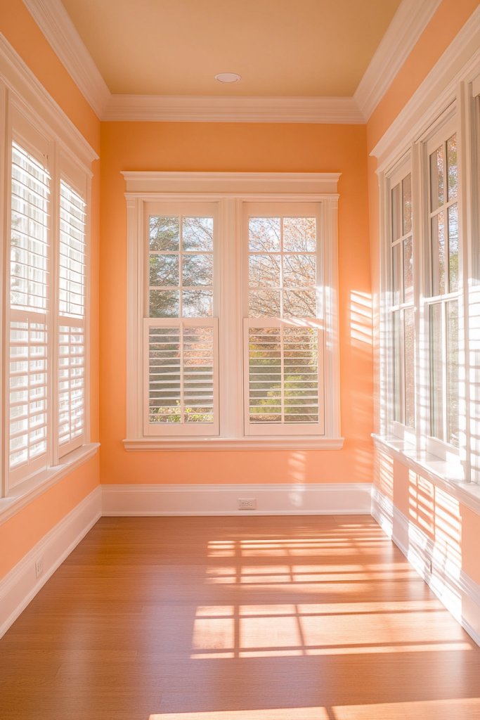 Imagine walls glowing in a gentle peach tone, softly catching the natural light. Complement with textured textiles in warm tones, such as terracotta or rust, to deepen the cozy atmosphere. Light-colored furniture and delicate accents enhance the warmth, creating a space that feels like a daily sunrise.