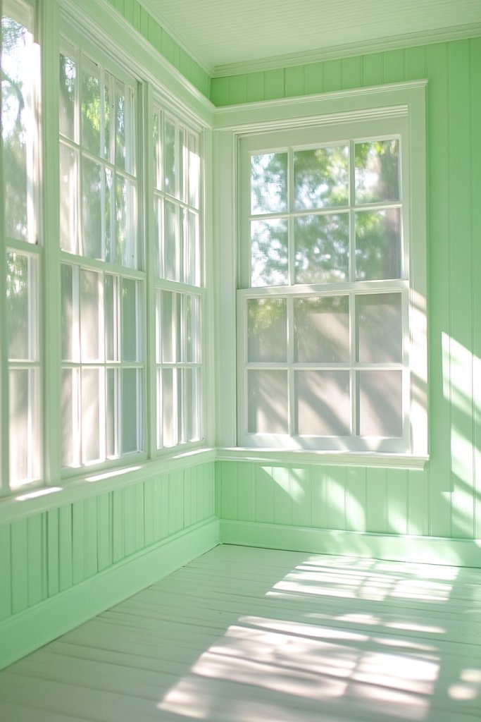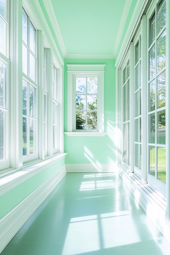 Visualize walls in a soft mint hue that instantly cools the senses. White trim and accents highlight architectural details and create a clean contrast. Light filters through sheer curtains, casting a calming glow. Decor in white, light wood, or metallics enhances the crisp, refreshing atmosphere.