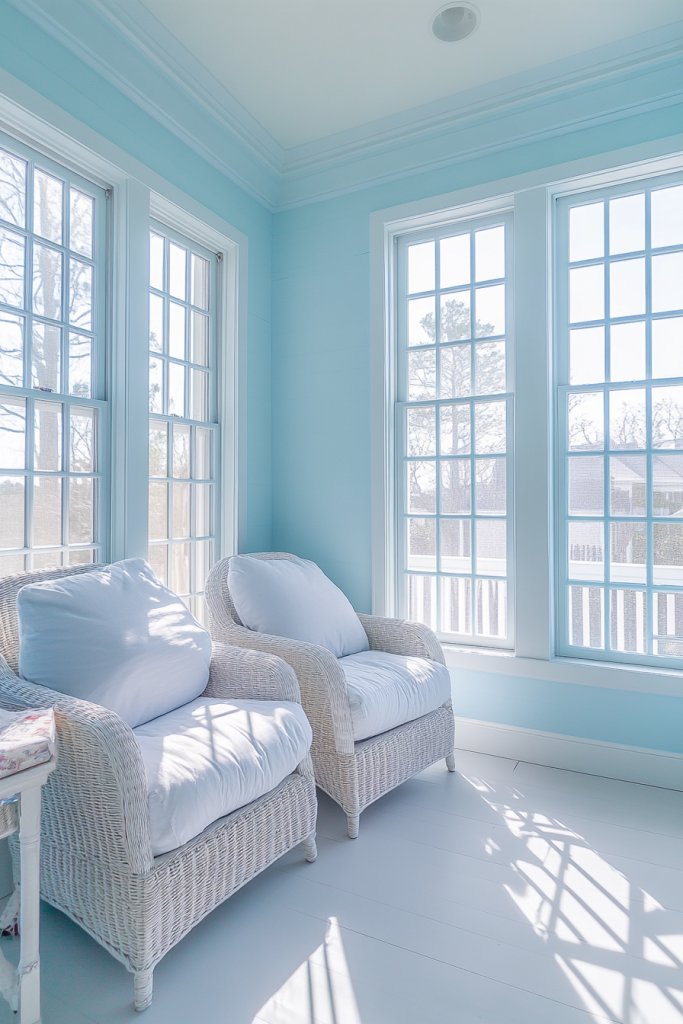 Envision walls painted in a soft, pale blue that feels like the sky on a clear day. White trim and moldings add crisp contrast, emphasizing clean lines. Light filters through sheer curtains, casting a gentle glow that enhances the nautical feel. Decor in navy, rope accents, or striped textiles complete the look.