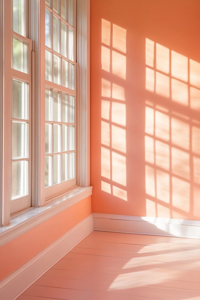 Imagine walls painted in a gentle coral or peach hue, softly glowing under natural light. Textured cushions, warm-toned throws, and natural wood accents complement the warm backdrop. The color exudes a subtle energy that energizes without overwhelming, making the space feel like a daily hug.