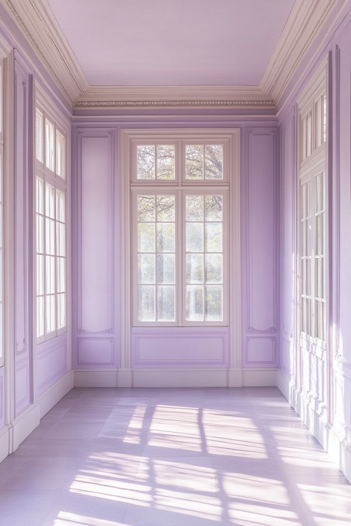 Visualize walls painted in a soft lavender hue that feels gentle yet refined. Light filters through sheer curtains, casting a subtle purple glow that enhances the tranquil vibe. Complemented by plush, neutral textiles and minimalist decor, the room radiates understated luxury.
