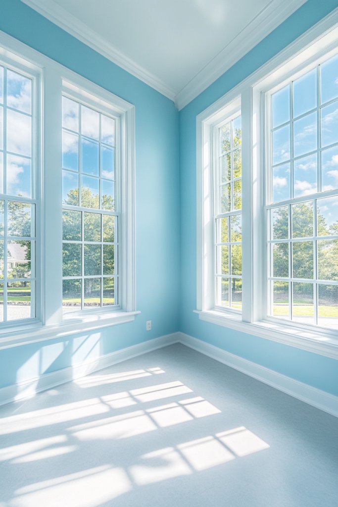 Picture walls painted in a delicate, powdery blue that mimics a clear sky at dawn. The soft hue evokes feelings of calm and openness, making the space feel larger and more inviting. Light-colored furnishings and airy curtains complement the soothing backdrop, while subtle textures add depth without overwhelming.