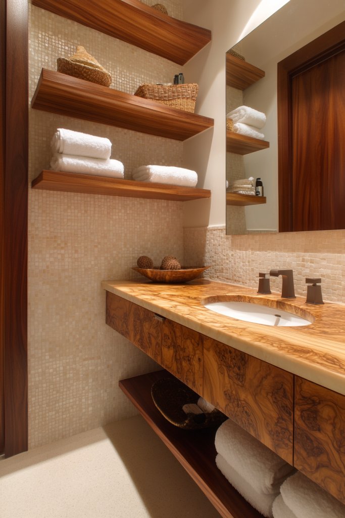 Imagine a bathroom with a light, reclaimed wood vanity top that catches the sunlight, adding softness and warmth. Picture floating shelves made of smooth, honey-toned wood holding rolled towels and simple decor. The natural grain and imperfections in the wood create an organic, calming backdrop. Soft, woven mats and textured wall panels complement the wood, creating a layered, tactile experience. It’s like bringing a piece of a tropical cabana into your home.