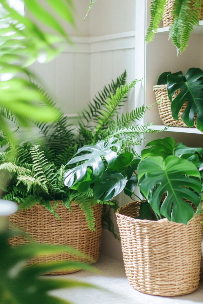 8. Add Greenery with Low-Maintenance Tropical Plants in Woven Baskets