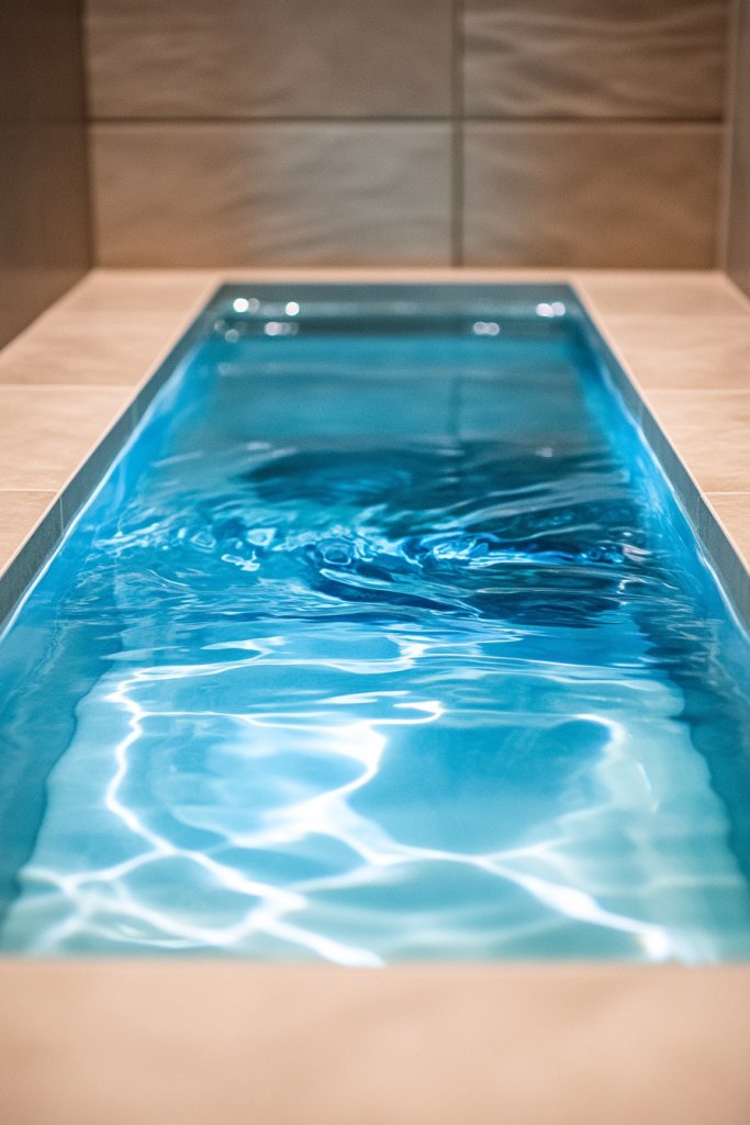 Picture a wall or floor section with shimmering blue glass tiles or acrylic panels that resemble a tranquil lagoon. Light reflects off the surfaces, creating a shimmering, water-like effect. Surround the area with natural stone or textured tiles to mimic a shoreline. Incorporate LED lighting behind or beneath the accents for a glowing, underwater feel. The overall effect is a peaceful, tropical escape that transforms your space.