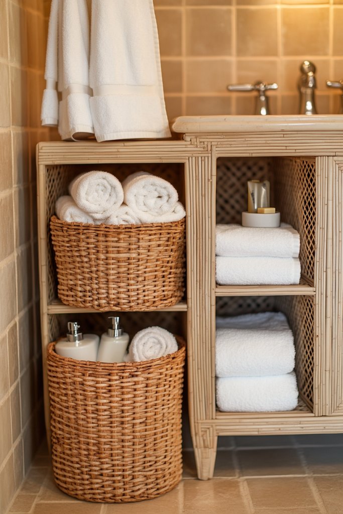 Choose from different weave patterns and natural finishes—light, dark, or stained—to match your decor. Incorporate woven baskets with lids for hidden storage, or open shelving for easy access. Seasonal swaps include replacing plain baskets with ones in tropical prints or brighter colors. For small bathrooms, stack baskets vertically to save space. Larger spaces can support multiple storage units for a curated look.