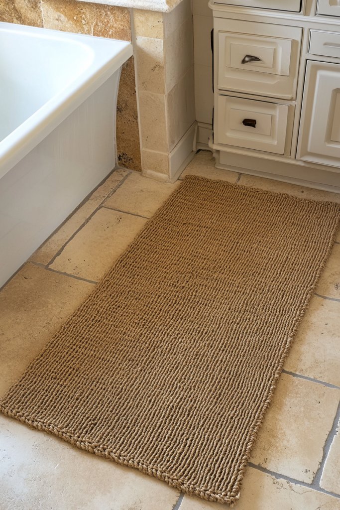 Visualize a jute or sisal rug with a chunky weave, placed in front of the vanity or shower. The neutral tones and textured surface add depth and warmth, complementing wooden or stone accents. The fibers have a natural matte finish that enhances the tropical aesthetic, making the space look relaxed and organic. Optional fringes or braided patterns add a handcrafted, artisanal feel. It’s like bringing a piece of the beach or jungle right under your feet.