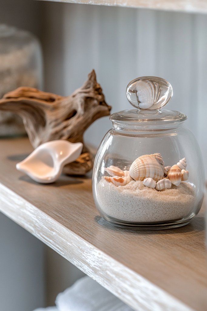 Use small, curated collections of nautical items—like miniature boats, shells, or coral—in vases or bowls. Mix vintage and modern pieces for an eclectic look. Seasonal updates could involve swapping in brighter, more colorful shells or adding starfish for summer. Incorporate metallic accents like brass or copper to add warmth. Keep accessories minimal to maintain a sophisticated, understated elegance.