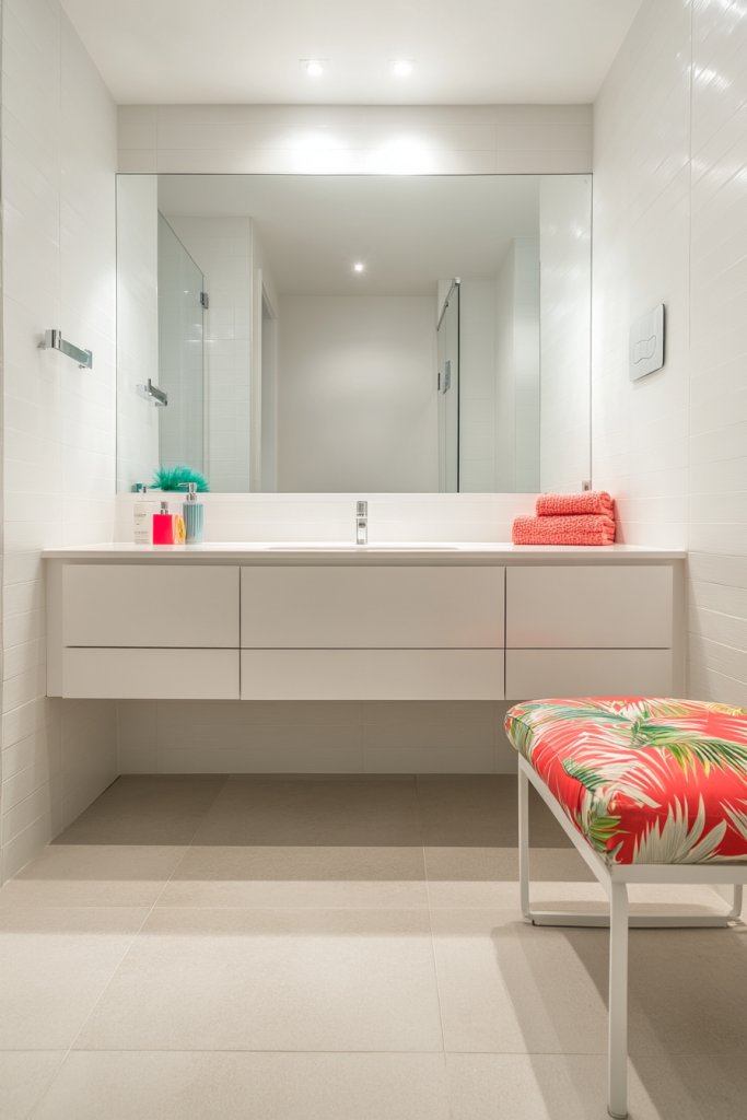 Imagine crisp white walls and sleek fixtures, accented by a single vibrant towel or artwork in tropical hues—think bright coral, lush green, or sunny yellow. The uncluttered space highlights these bursts of color, making them feel intentional and fresh. Textures like linen, smooth ceramics, and matte finishes keep the look modern and understated. The overall effect is calming yet lively, like a tropical breeze in an urban oasis.