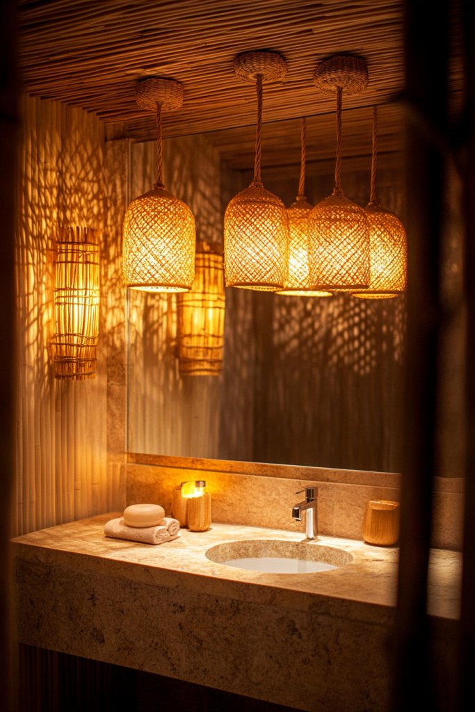 Select high-quality rattan or bamboo fixtures rated for bathroom humidity. Install fixtures securely into wall anchors or ceiling mounts, following safety guidelines. Use warm white or soft yellow bulbs to enhance the natural feel. If installing sconces, position them at eye level for the best effect. For pendant fixtures, hang at a height that frames the space well without obstructing movement. Regular dusting and occasional re-sealing preserve the woven texture.