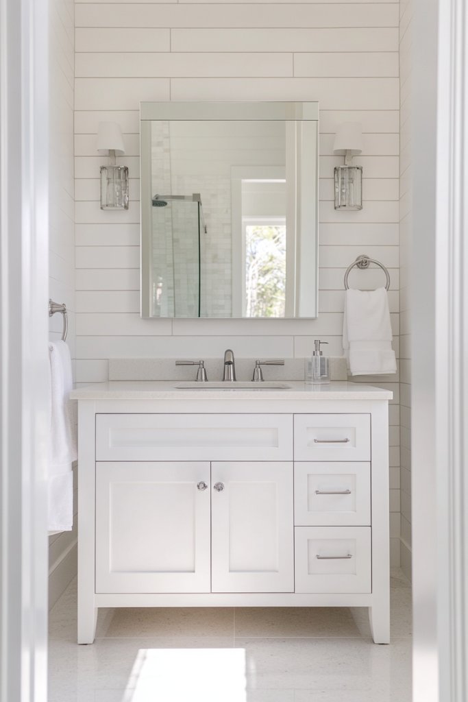 Decorate with tropical-themed textiles, such as patterned towels or curtains, that enhance the airy feel. Incorporate textured wall panels or molding for added depth. Use mirrors strategically to reflect light and amplify the space. Play with lighting—install sconces or indirect lighting to create a warm glow. Keep decor minimal to maintain the clean, bright aesthetic, letting the walls do the heavy lifting.