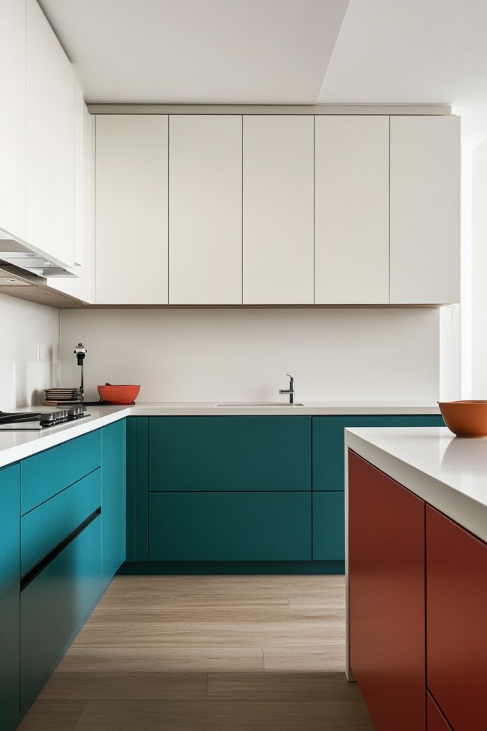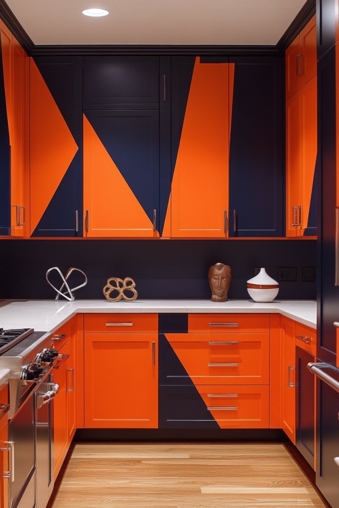 19. Two-Tone Cabinets with Color Blocking and Geometric Patterns