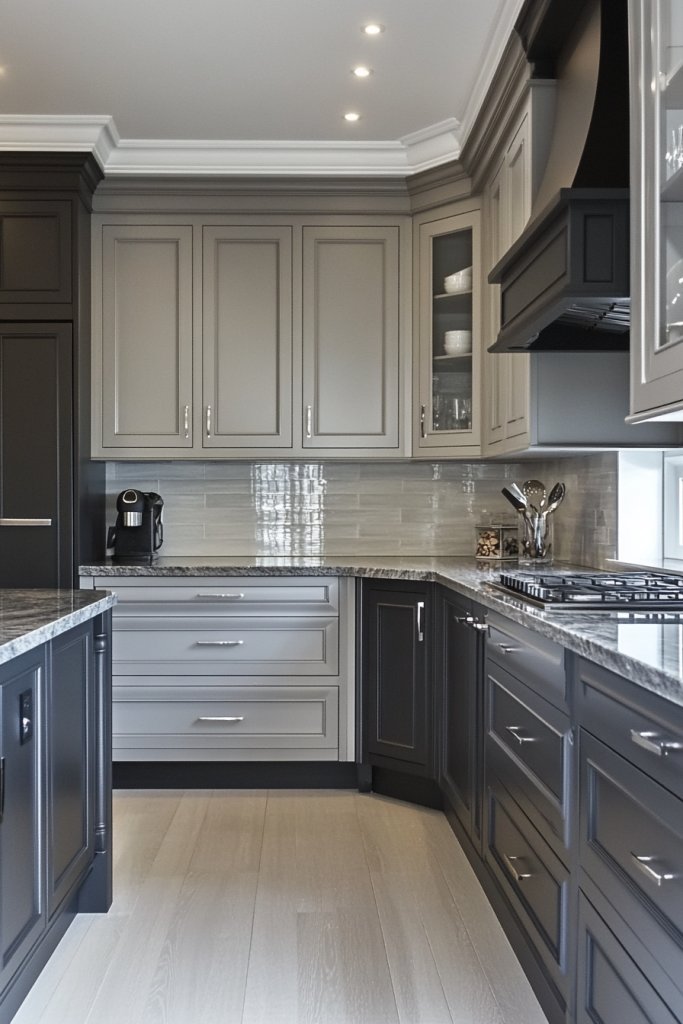 Visualize matte black upper cabinets that absorb light, contrasted by light grey lower cabinets that brighten the space. The matte finish adds a velvety texture, creating a sophisticated, understated look. The clean lines and contrasting tones give the kitchen a streamlined, open feel, especially when combined with minimalist hardware and lighting. It’s like a fashion-forward outfit but for your kitchen.
