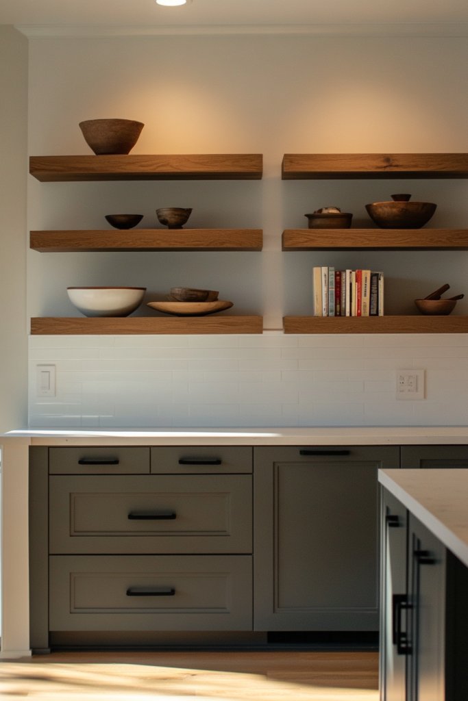 Install open shelves in a sturdy, wall-mounted system with your chosen color or finish. Use brackets or floating shelf hardware that complements your cabinetry style. Keep the shelves organized with labeled containers or decorative baskets. Ensure the lower cabinets have ample storage for less attractive items. Regularly dust and clean to keep everything looking crisp.