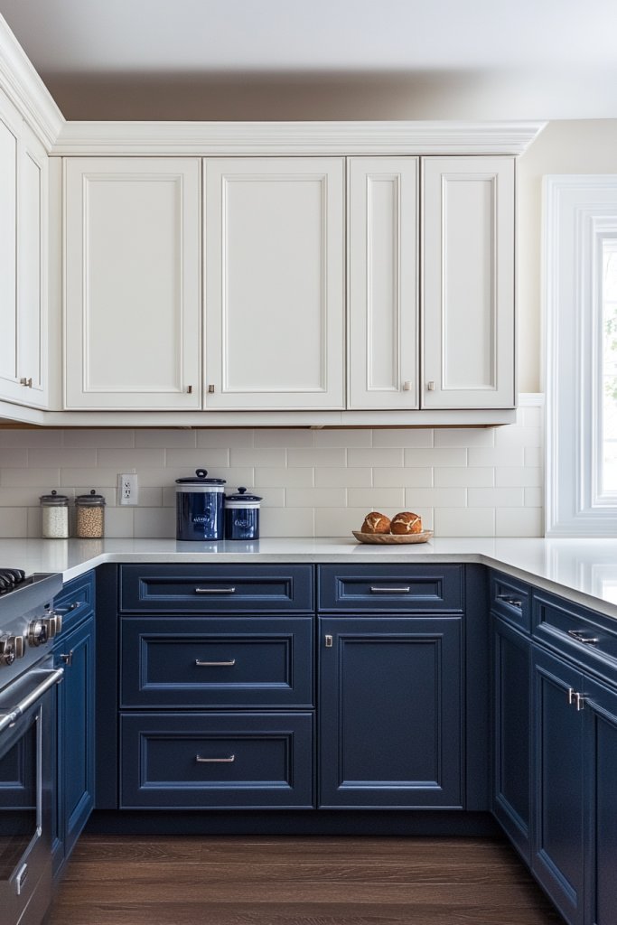 Imagine sleek white upper cabinets reflecting a clean, bright atmosphere, while the vibrant navy or emerald bases ground the space with a punch of color. The contrast creates a striking visual balance, making your kitchen feel lively yet organized. Textured finishes on the lower cabinets add depth, while the glossy white uppers bounce light around. It’s a look that’s both bold and sophisticated.