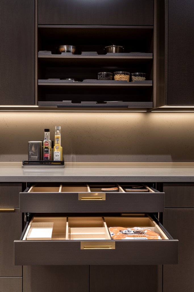Visualize deep grey lower cabinets with built-in pull-out pantry drawers in a contrasting white or light color. The integrated storage keeps everything tucked away neatly, while the contrasting hues highlight different zones. Hidden compartments or custom inserts enhance accessibility and organization. The overall look is sleek and purposeful.