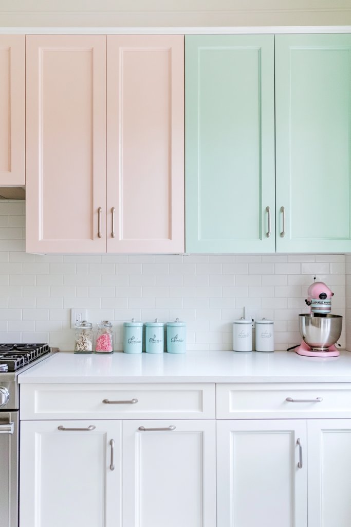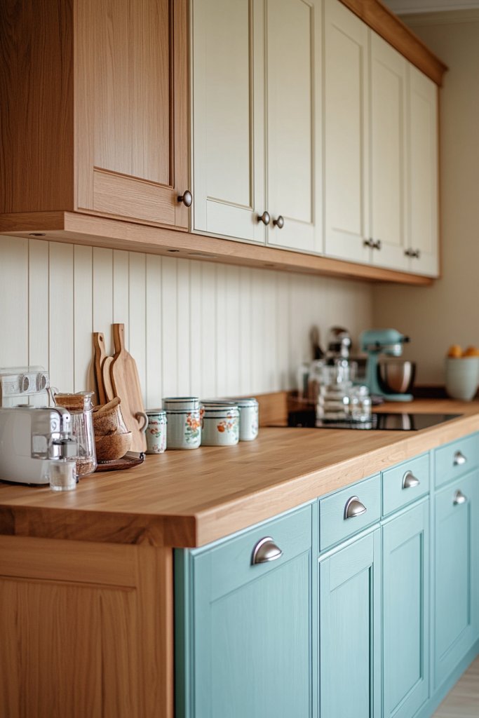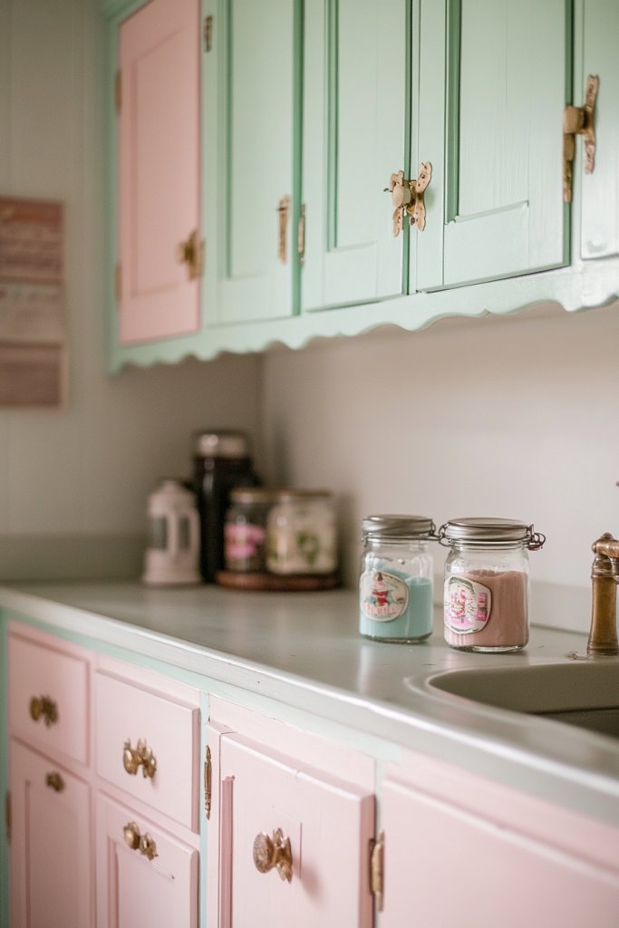 9. Two-Tone Vintage-Inspired Cabinets with Soft Pastel Colors