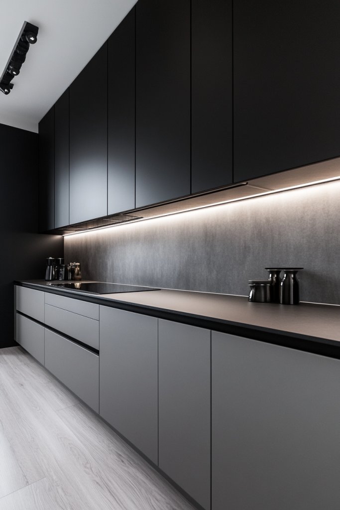 Start with high-quality matte paint or laminate for black upper cabinets. Use durable, easy-to-clean finishes on the grey lower cabinets. Opt for sleek, modern hardware in contrasting metallics—think matte black or brushed gold. For a seamless look, install hidden handles or push-to-open mechanisms. Incorporate under-cabinet LED lighting to highlight the matte textures and contrast. Keep the design minimal to emphasize the color blocking.